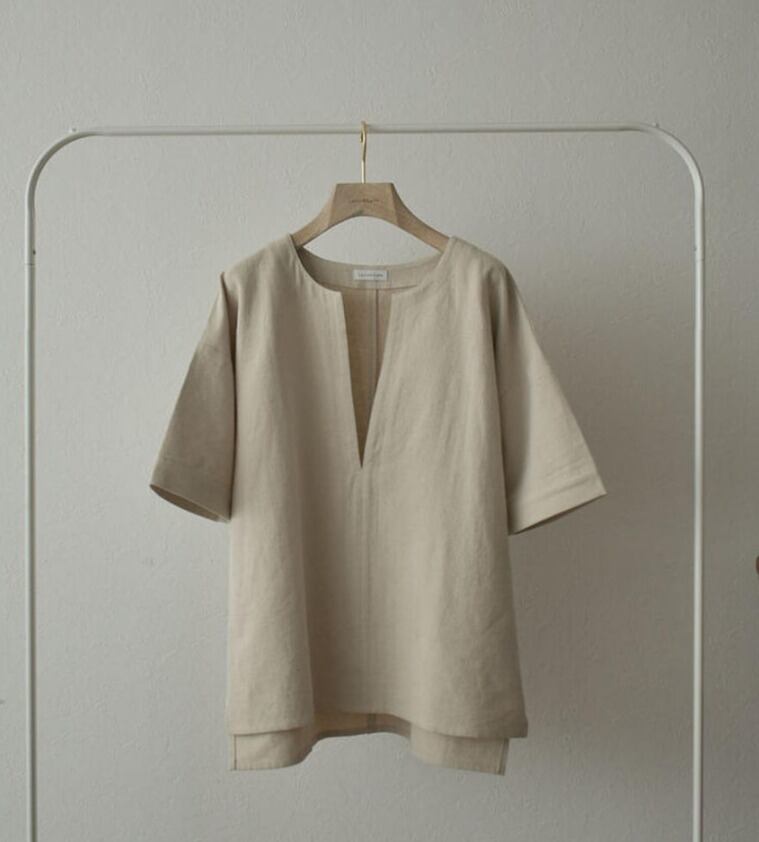 トップスは薄手でシンプルなデザインなので、どんなシーンでも合わせやすいのがポイント!深いVネックが爽やかな印象です♪