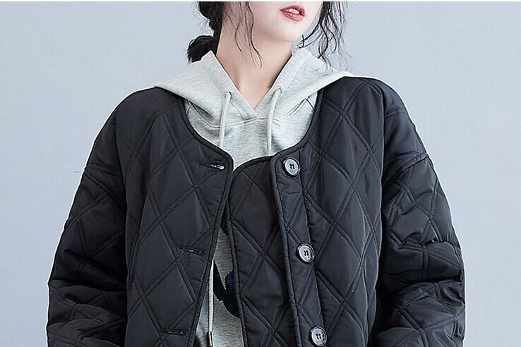 シンプルながらも上品さを演出するキルティングコート。ノーカラータイプで、カジュアルからきれいめまで、幅広いスタイルにマッチします。フロントのボタンとポケットがアクセントになり、さりげないおしゃれさをプラス。冬の防寒対策にも最適な中綿仕様で、軽くて暖かい着心地をキープ。
