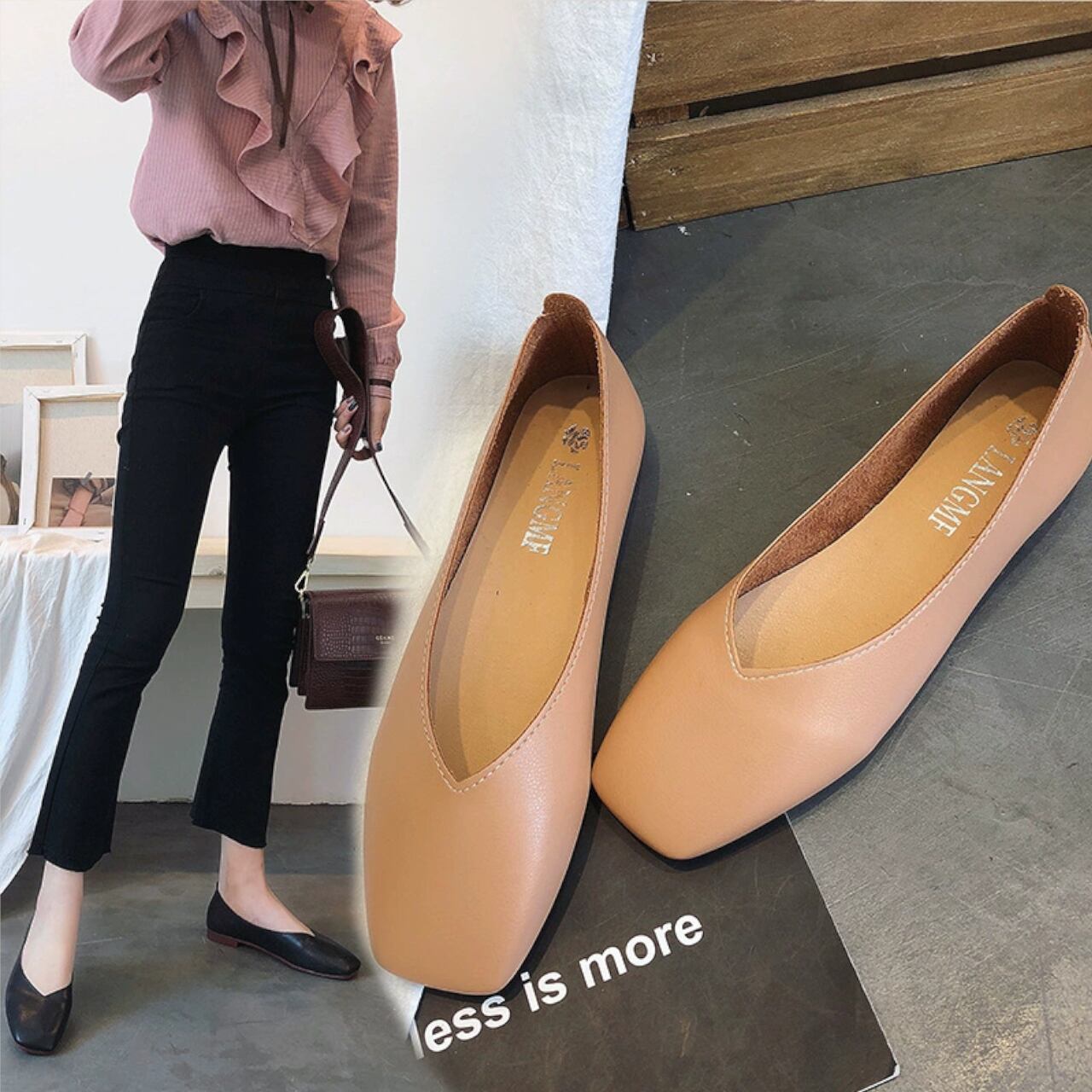 スクエアトゥのデザインが目を引く、こなれ感のあるぺたんこパンプス。