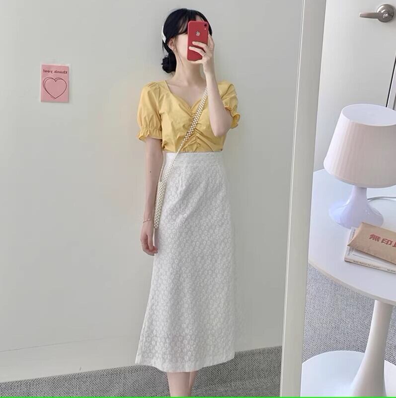 ツーピース セットアップ レディース スカート ブラウス カットソー プルオーバー ミモレ ロング 半袖 ボリューム袖 パフスリーブ 襟なし ノーカラー スリム 刺繍 ハイウエスト ウエストゴム 透け感 コンサバ 薄手 裏地付き さらさら かわいい 大人可愛い きれいめ シンプル カジュアル おしゃれ レトロ こなれ感 ラフ ガーリー 個性的 抜け感 ラブリー キュート 都会的 ラグジュアリー ナチュラル 休日感 たおやか フェミニン 大人女子 控えめ フラワー ホワイト イエロー