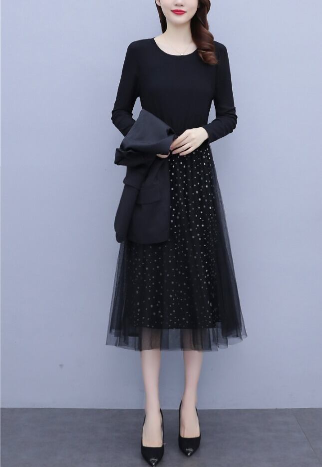 ワンピースは、膝下丈の切り替えデザインでチュールスカートがエレガントな印象です☆