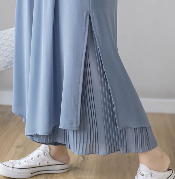 フレア&プリーツの重ね着風ドッキングデザインが動く度に表情が変わって素敵♪キュートでフェミニンな9分丈ガウチョパンツ。春夏のオシャレにピッタリなシフォン素材は涼しげで爽やか。スーパーワイドなので体型カバーはもちろんの事、ストンとした落ち感もあるので細見え効果も♡ウエストゴムなのも嬉しいポイント♪
