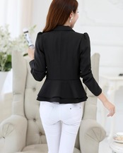 ショート丈のテーラードジャケットにフリルが加わり、かわいらしさと大人の可愛さを兼ね備えたデザインです。シンプルながら上品でおしゃれ、かっこよさも漂うモード系のエレガントな仕上がり。存在感のある角襟とフロントのポケットがアクセントとなっています。春から秋まで着用でき、入学式や入園式、卒業式や卒園式、謝恩会や授業参観、会議やMTG、オフィスやビジネス、OLの通勤からお出かけ、パーティーやイベント、発表会まで多彩な場面で活躍します。
