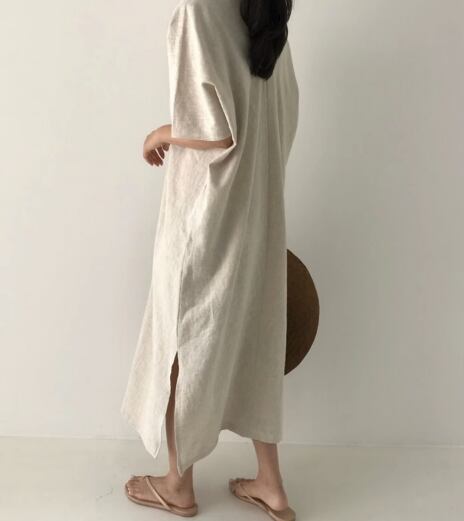 涼しげな綿麻素材のワンピースです。Vネックとフレアシルエットが女性らしさを引き立て、大人可愛い雰囲気を演出します。さまざまなシーンに合わせて活躍する着こなしを楽しめる一着です。