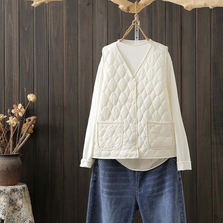 エレガントさとカジュアルさを兼ね備えたキルティングベスト。Vネックとストレートなシルエットが、女性らしい印象を与えます。軽量で暖かく、寒い季節にぴったりです。