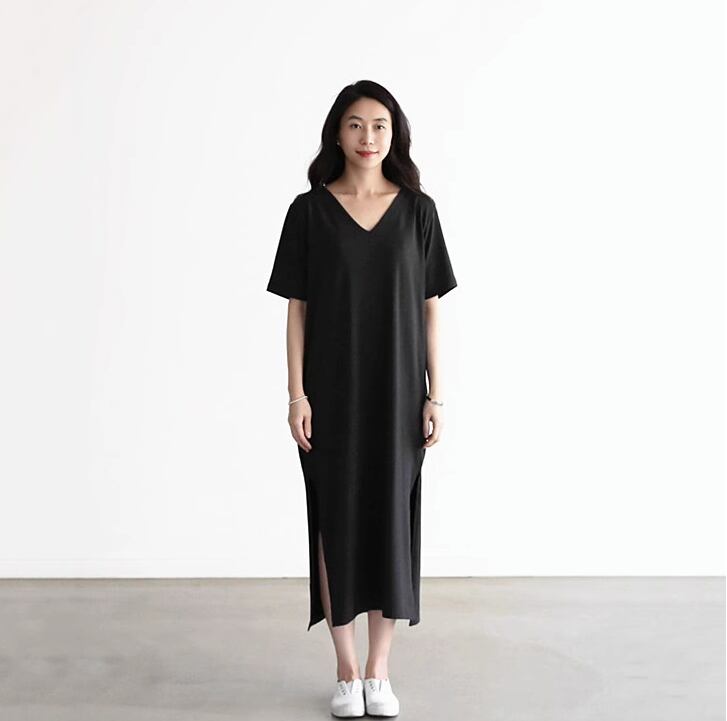 シンプルなデザインながらも、Vネックやスリムなシルエットが女性らしさを引き立てます。