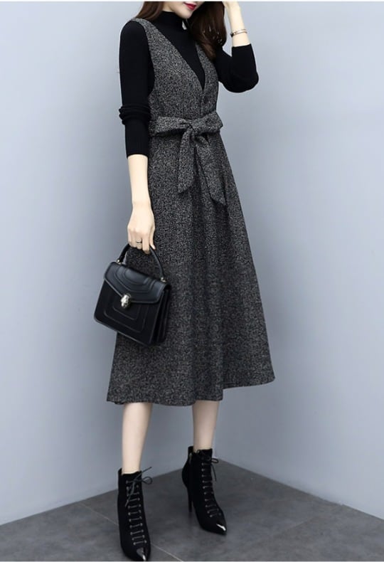 レディース スカート ワンピース カットソー セットアップ スリーピースセット ジャンパースカート ミモレ 長袖 ハイネック 細身 ウエストリボン ポケット 厚手 大人可愛い シンプル カジュアル レトロ アジアン エスニック ラブリー キュート ロマンティック 無地 オールシーズン 授業参観 会議 ママ オフィス ビジネス 通勤 デート レストラン 女子会 休日 ショッピング カフェ 重ね着 楽ちん 体型カバー 美脚 脚長 普段使い 着回し M L XL 2XL 3XL 4XL 5XL 黒 ブラック