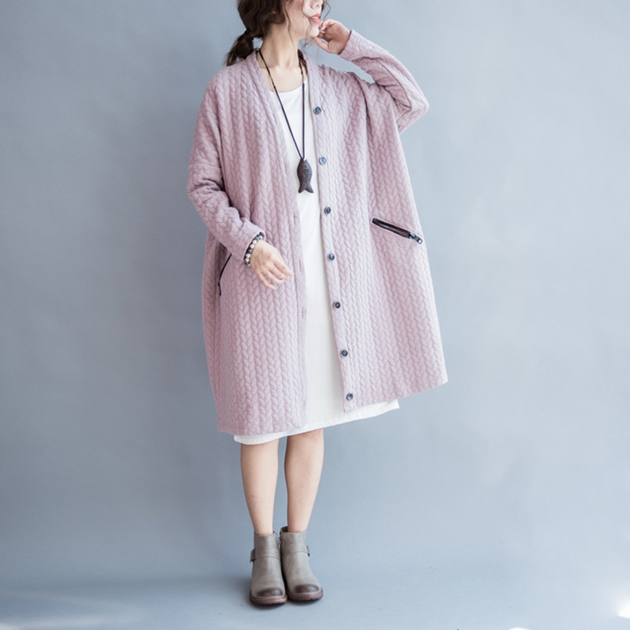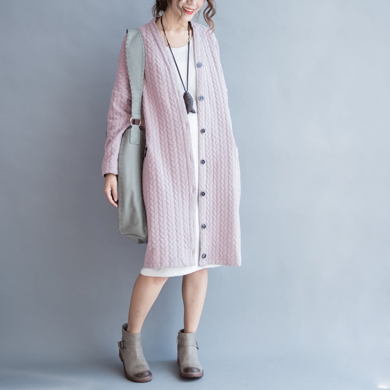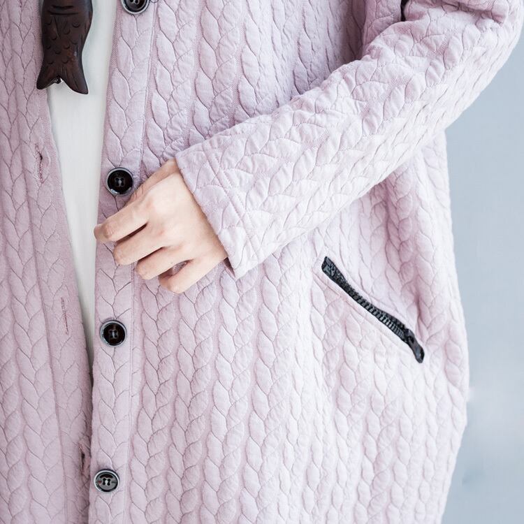 Vネックで首元をすっきりと見せ、ボタンで留めるタイプなので、着脱も簡単です。