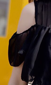 さらに、オープンショルダーとラウンドネックのデザインで、大人可愛い印象をプラス。