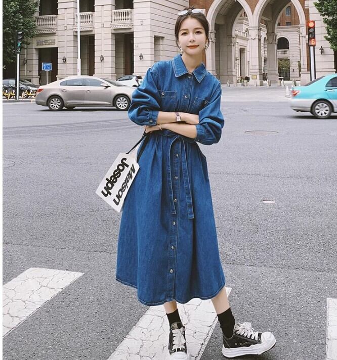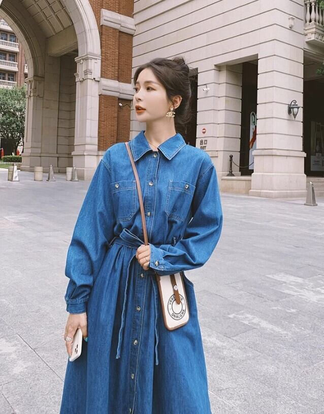 ブルーデニムのシャツワンピース。大人可愛いデザインで、シンプルながらもおしゃれで都会的な雰囲気を漂わせます。モード系の主役級アイテムで、存在感と抜け感が魅力です。長袖と襟付きが上品な印象を与え、ポケットと前開きが機能的。OLから学生まで、通学やデート、お出かけやお泊まり、イベントやリゾート旅行、レストランや公園、女子会や休日、ホテルやガーデン、ショッピングやライブ、お花見や合コン、カフェや婚活、韓国のオルチャンコーデまで、あらゆるシーンで活躍。着回し力抜群で、普段使いにぴったりです。