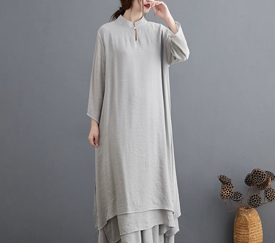 2点セット レディース パンツ ボトムス ワンピース ワイドパンツ ロング 長袖 ラウンドネック 襟なし Aライン スリット サイドスリット ウエストゴム 薄手 かわいい 大人可愛い きれいめ シンプル カジュアル おしゃれ こなれ感 ラフ ルーズ 個性的 主役級 存在感 とろみ感 抜け感 ナチュラル 無地 春 秋 誕生日 発表会 授業参観 大会 会議 MTG ミーティング プレゼン ママ マタニティ オフィス ビジネス OL 通勤 学生 学校 通学 デート お出かけ お泊まり 旅行 海 レストラン