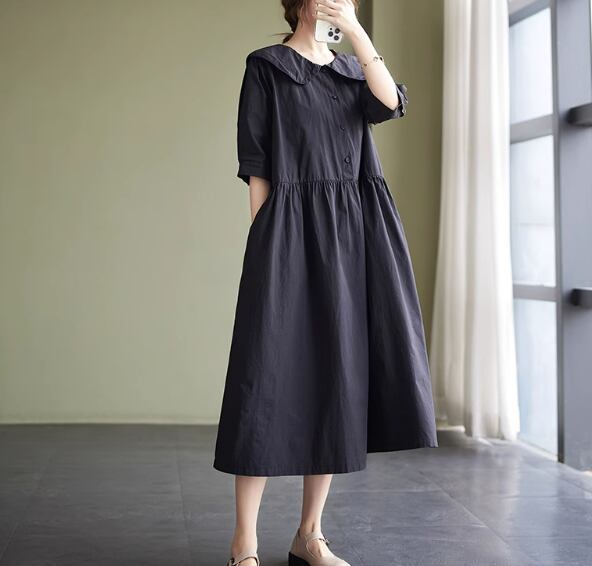 レディース スカート ワンピース フレアスカート ロング 8分丈 5分袖 ラウンドネック 襟付き 丸襟 ワイド Aライン ポケット かわいい 大人可愛い きれいめ シンプル カジュアル おしゃれ レトロ こなれ感 ラフ ガーリー 個性的 存在感 とろみ感 抜け感 キュート 無地 誕生日 ママ マタニティ OL 通勤 学生 デート お出かけ イベント リゾート 旅行 公園 女子会 休日 バカンス ショッピング コンサート 合コン コンパ カフェ 婚活 楽ちん 体型カバー 普段使い モテ ゆったり ゆる