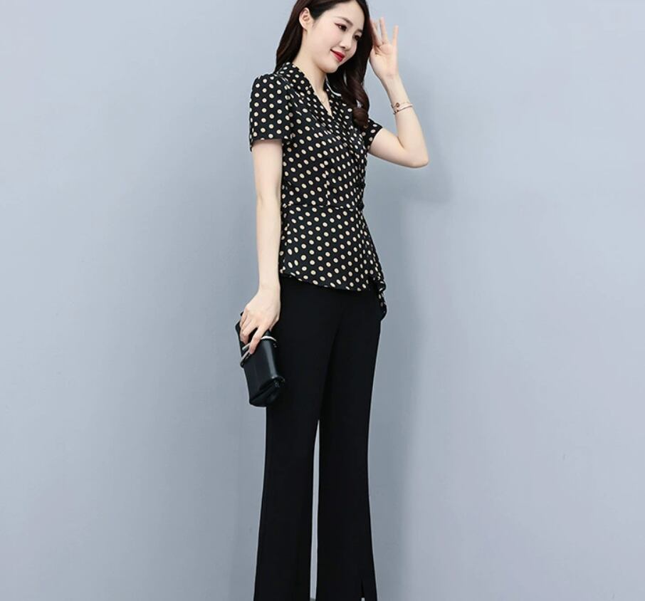 チャイナ風 2点セットレディース トップス パンツ ボトムス シャツ ブラウス ロング 半袖 Vネック 襟付き 角襟 ペプラム スリット ハイウエスト 異国風 薄手 かわいい 大人可愛い きれいめ シンプル カジュアル おしゃれ アジアン こなれ感 ラフ 個性的 主役級 存在感 とろみ感 抜け感 ドット柄 水玉 夏 誕生日 発表会 授業参観 大会 会議 MTG ミーティング プレゼン ママ マタニティ オフィス ビジネス OL 通勤 学生 学校 通学 デート お出かけ お泊まり 旅行 海 レストラン 公園