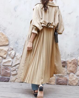 きちんと感のある襟付きトレンチコートが登場しました。プリーツデザインが特徴で、おしゃれな印象を与えます。ウエストリボンでウエストマークをすることで、女性らしいシルエットが作れます。透け感のある切り替えデザインもあり、さりげないおしゃれ感を演出できます。