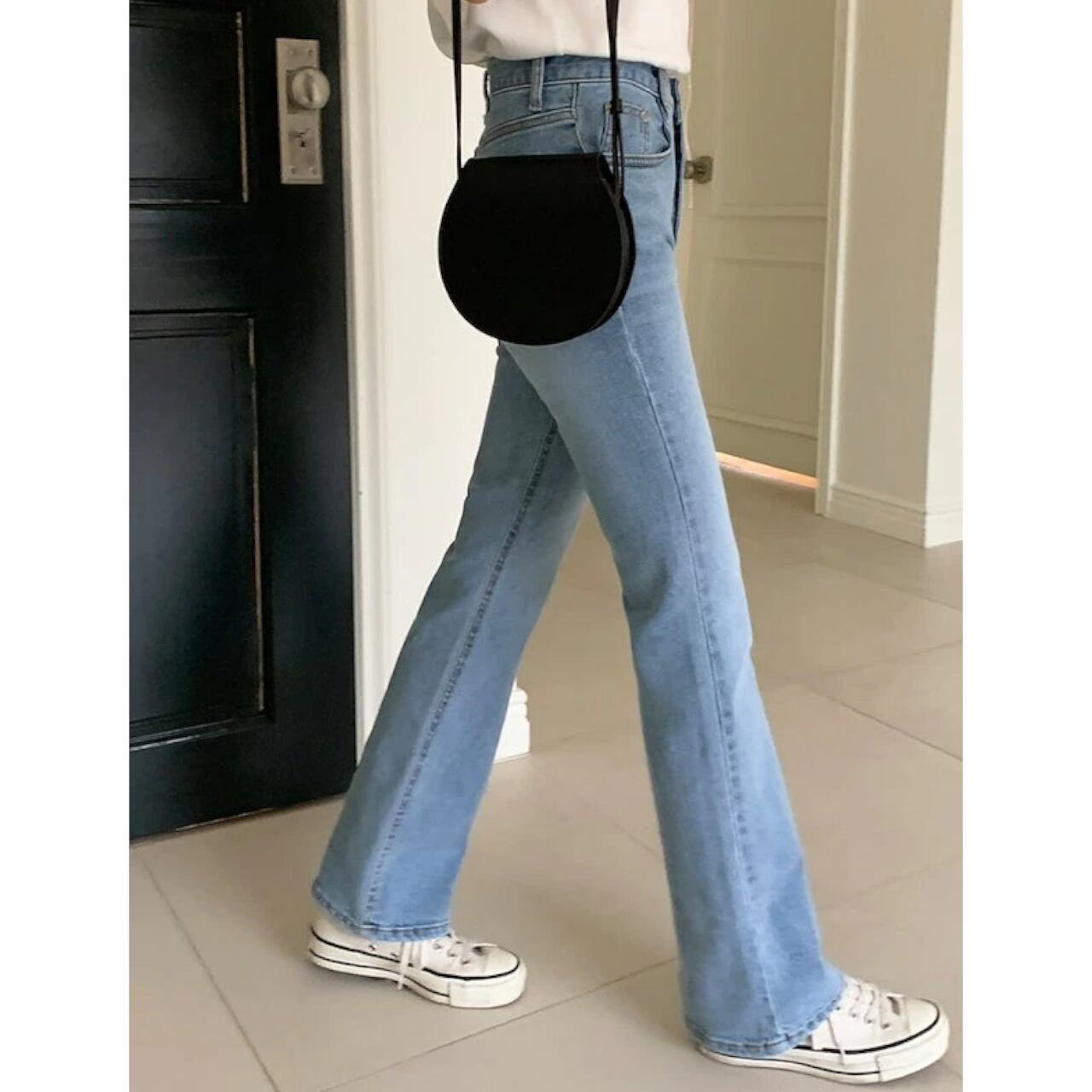 このデニムは、脚を長くスタイリッシュに見せる効果があります。