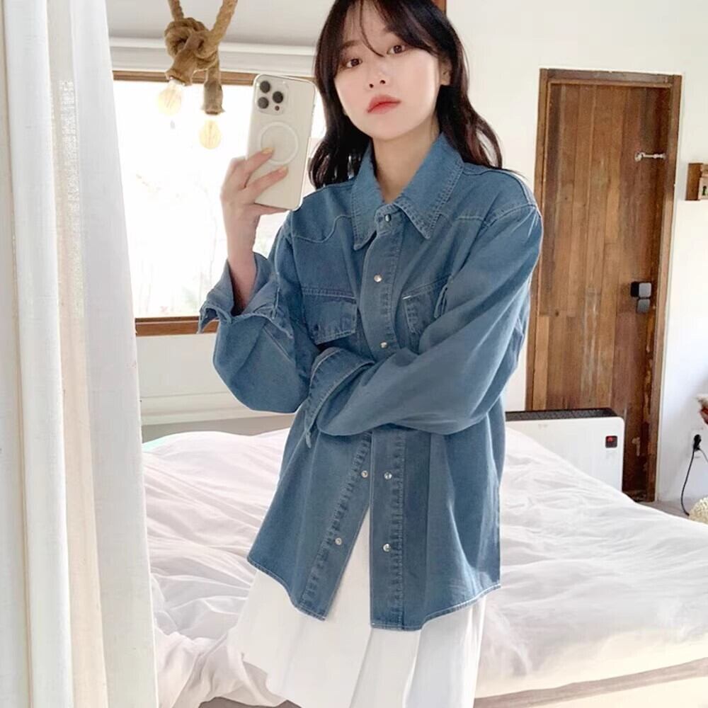 レディース トップス シャツ 上着 デニム 羽織 Yシャツ 長袖 襟付き 角襟 ストリート ルーズ ポケット 前開き ボタン アメカジ 胸ポケット フロントボタン 袖口ボタン ブルーデニム 薄手 シンプル カジュアル おしゃれ こなれ感 ラフ 抜け感 ベーシック ナチュラル 無地 オールシーズン ロングシーズン お出かけ アウトドア 公園 休日 ショッピング お花見 重ね着 お揃い 楽ちん 体型カバー 普段使い 着回し レイヤード ロールアップ 定番 ゆったり ゆる フリーサイズ ブルー ダークブルー