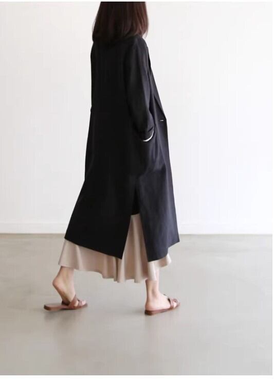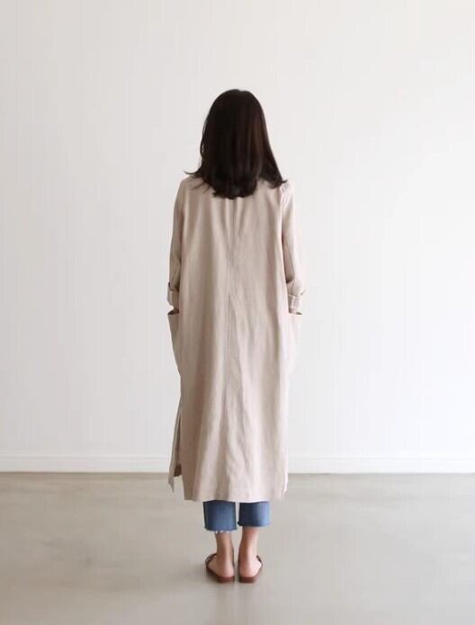 上品なロングコートにチェスターデザインが個性的な襟付き角襟がアクセント。シンプルでありながらもかわいさと大人の可愛らしさが光るアイテムです。カジュアルからフォーマルまで、都会的なスタイリングにピッタリ。春から夏にかけても活躍する無地デザインです。