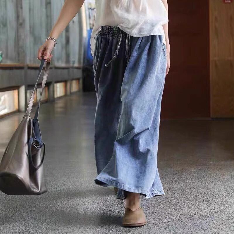 レディース パンツ ボトムス デニム ガウチョパンツ ロングパンツ ワイドパンツ ロング ワイド フレア Aライン オーバーサイズ ポケット ウエストゴム ドロスト デニム ブルーデニム 柔らか 大人可愛い シンプル カジュアル おしゃれ レトロ こなれ感 ラフ ルーズ 個性的 存在感 抜け感 ヴィンテージ カレッジ風 アクティブ 休日感 活発 ニッチ リラックス 無地 春 夏 アウトドア リゾート バカンス カフェ 散歩 レジャー 楽ちん 体型カバー 普段使い 着回し トレンド ゆったり ブルー