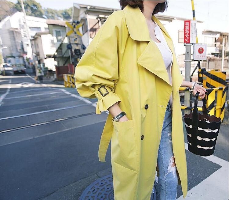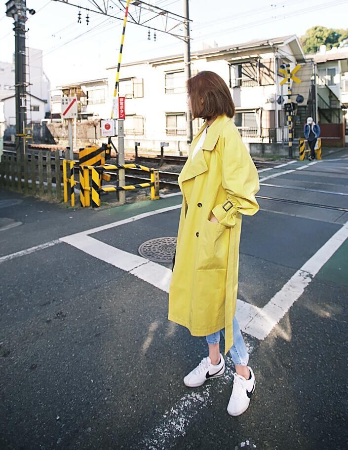レモンイエローのトレンチコートは、コーデに明るいアクセントを加えてくれます☆