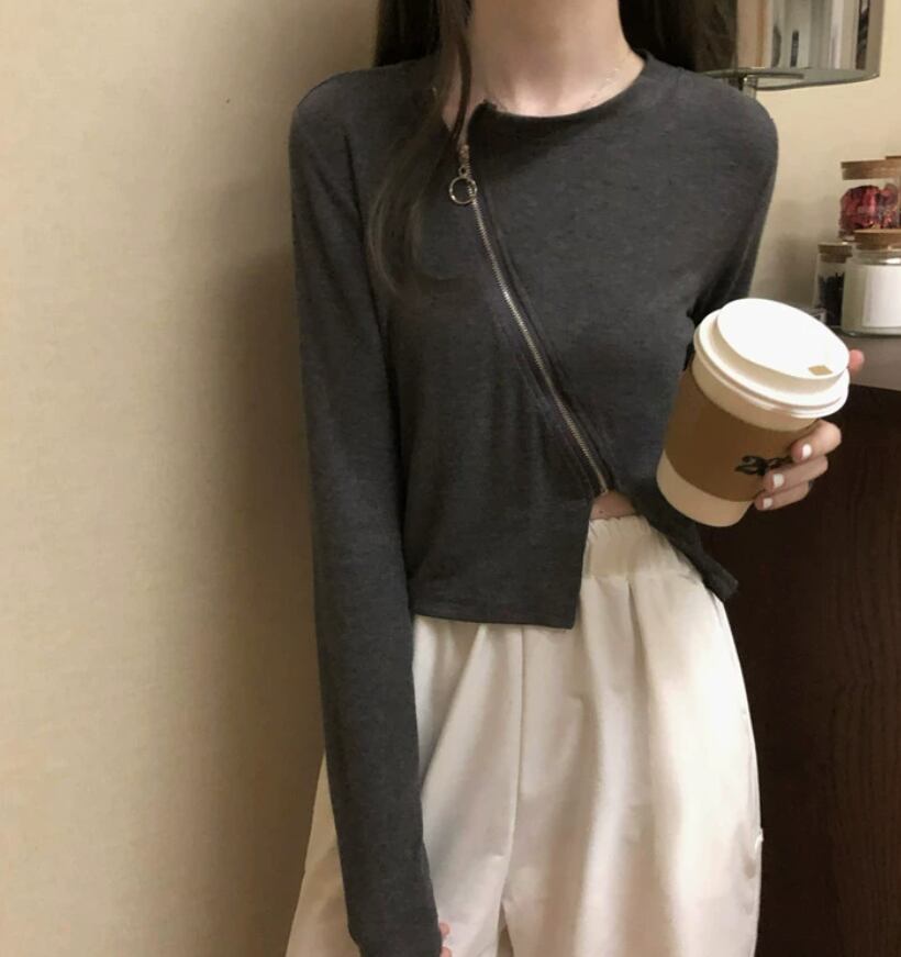 レディース トップス Tシャツ ショート 長袖 萌袖 ラウンドネック 襟なし タイト スリム 細身 ファスナー ハイウエスト 前開き 薄手 かわいい 大人可愛い シンプル カジュアル おしゃれ こなれ感 ラフ 個性的 主役級 存在感 とろみ感 抜け感 無地 春 秋 誕生日 発表会 授業参観 大会 会議 MTG ミーティング プレゼン ママ オフィス ビジネス OL 通勤 学生 学校 通学 デート お出かけ お泊まり 旅行 海 レストラン 公園 女子会 休日 高原 ホテル ガーデン ショッピング コンサート