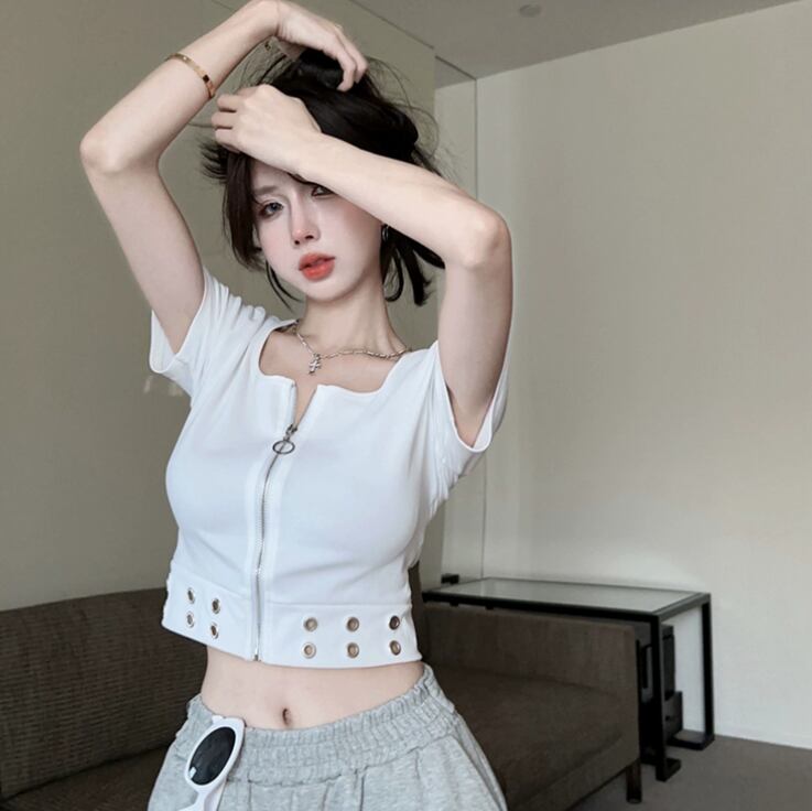 穴あき レディース トップス Tシャツ ショート 半袖 ラウンドネック 襟なし タイト スリム 細身 ファスナー 前開き 薄手 かわいい 大人可愛い シンプル カジュアル おしゃれ かっこいい こなれ感 ラフ 個性的 主役級 存在感 とろみ感 抜け感 無地 夏 誕生日 発表会 授業参観 大会 会議 MTG ミーティング プレゼン ママ マタニティ オフィス ビジネス OL 通勤 学生 学校 通学 デート お出かけ お泊まり 旅行 海 レストラン 公園 女子会 休日 高原 ホテル ガーデン ショッピング コ