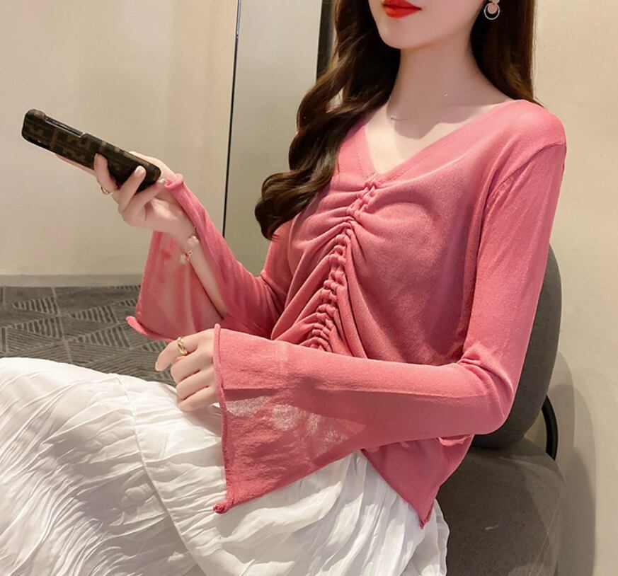 透け感のある素材が、上品な抜け感を演出します。Vネックデザインで、首元をスッキリと見せてくれます。