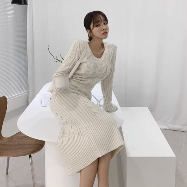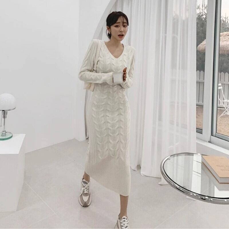 レディース ワンピース ニットワンピ ミモレ 長袖 萌袖 Vネック 襟なし ノーカラー スリム 細身 Iライン ニット ケーブルニット ストレッチ 伸縮性 柔らか ハイゲージ 大人可愛い きれいめ シンプル カジュアル おしゃれ レトロ こなれ感 ラフ ガーリー 存在感 抜け感 キュート ラグジュアリー カレッジ風 アクティブ ナチュラル 休日感 フェミニン 大人女子 控えめ ケーブル柄 秋 冬 デート お出かけ アウトドア ショッピング 合コン 韓国 楽ちん 普段使い 着回し モテ トレンド ホワイト