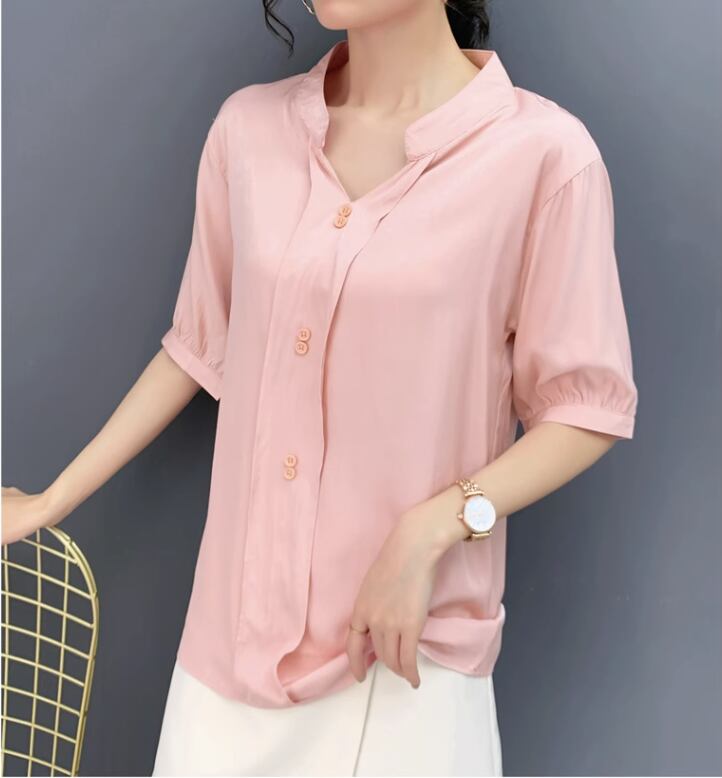 シフォン素材が優雅な印象を与えるレディースシャツ。Vネックと襟付きのデザインで、女性らしさを引き立てます。シースルーバックシャンシャツのディテールが上品なアクセントを加えています。半袖なので、春夏の季節にぴったりのアイテムです。