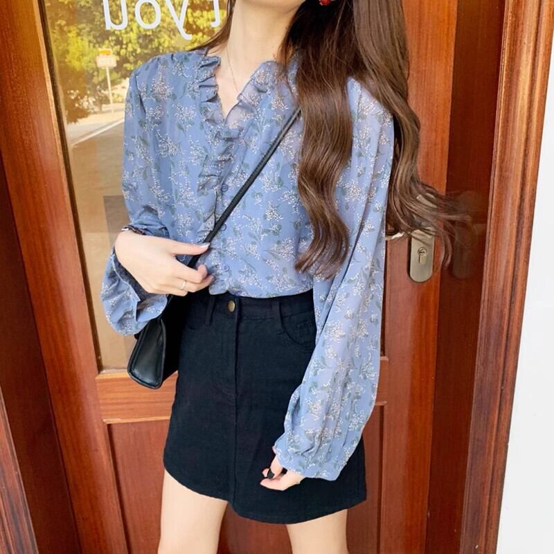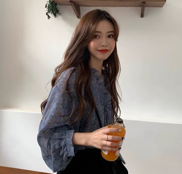 レディース シャツ ブラウス カットソー 長袖 パフスリーブ Vネック フリル襟 フェミニン ふわっとシルエット シフォン フリル 前開き 透け感 シースルー ボタン フロントボタン 袖口ボタン 薄手 かわいい 大人可愛い きれいめ シンプル カジュアル 上品 おしゃれ ガーリー キュート ロマンティック 花柄 小花柄 春 夏 秋 オフィス ビジネス デート お出かけ ショッピング 合コン お呼ばれ 体型カバー モテ 清楚 涼しい S M L XL ゆったり 青 ブルー 白 アイボリー 黄色 イエロー