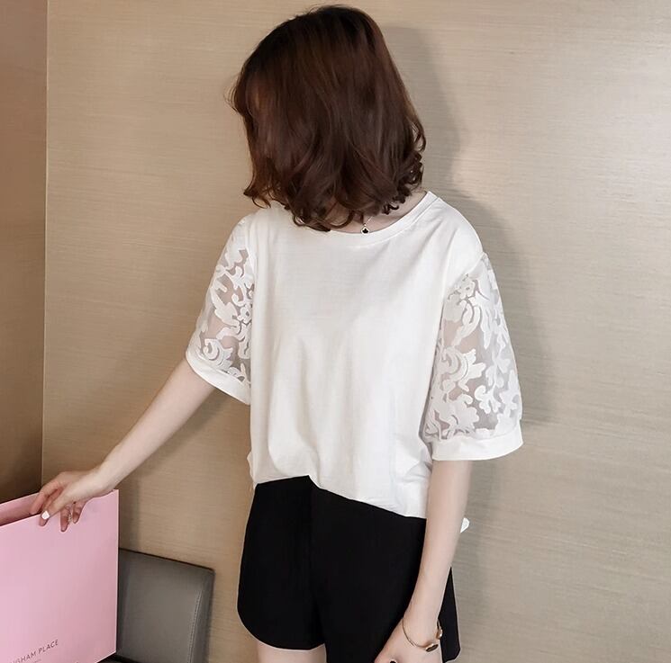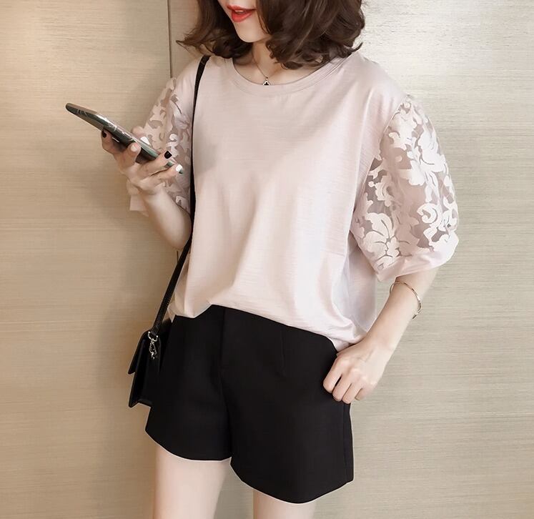 フェミニンなレース袖がポイントのプルオーバーTシャツです。ラウンドネックで顔映りがよく、5分袖で程よい肌見せが叶います。薄手で透け感のある素材で、夏にぴったりです。デニムやスカートなど、どんなボトムスとも合わせやすい万能アイテムです。
