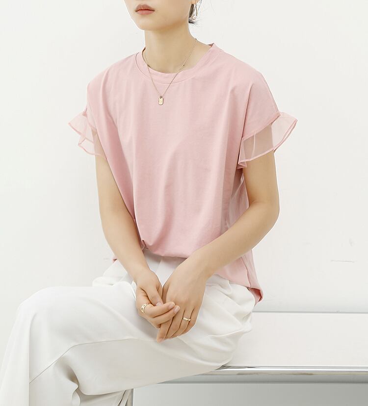 フリル袖がフェミニンな半袖Tシャツ。ラウンドネックで首元がスッキリ見えます。シフォン袖が透け感をプラスし、涼しげな印象に。スリムなシルエットでスタイル良く着こなせます。カジュアルにもきれいめにも着こなせる万能トップスです。