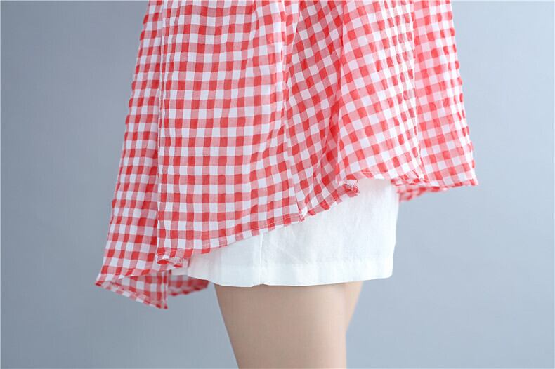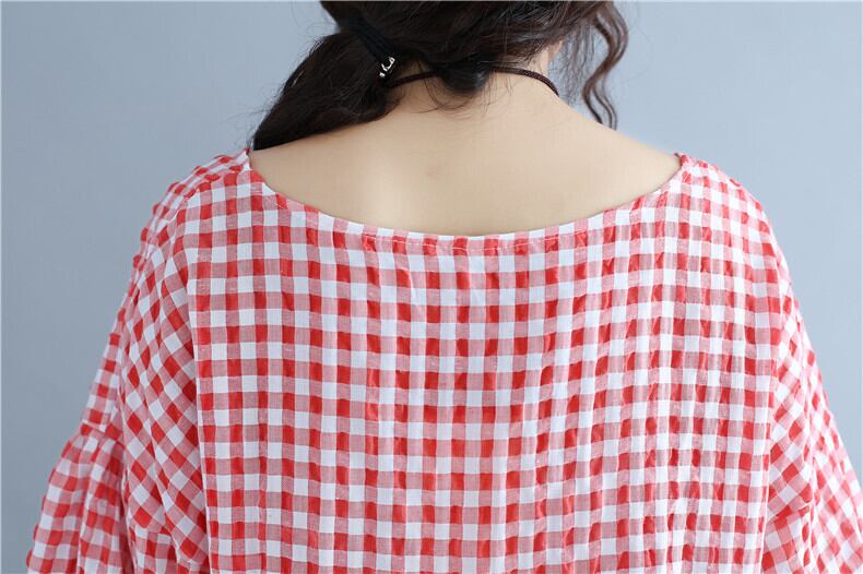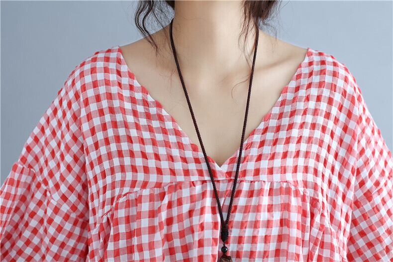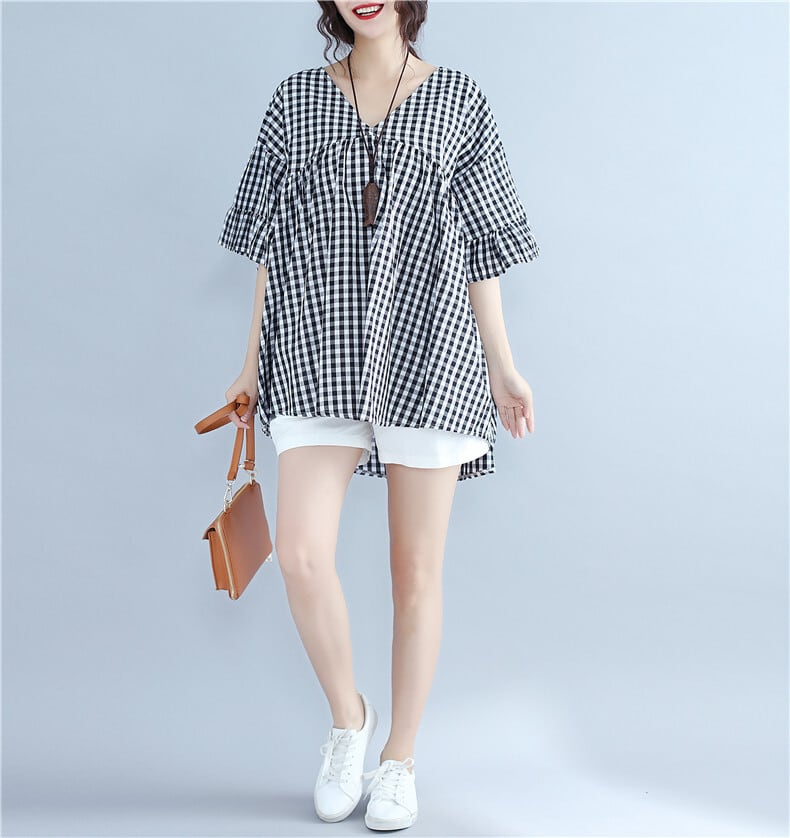ギンガムチェックのチュニックトップスです。5分袖のフレアスリーブとVネックで、女性らしいシルエットに仕上げました。ワイドシルエットで体型カバーもできるので、幅広い体型の方にお勧めです。カジュアルからキレイめまで、様々なコーディネートにお使いいただけます。