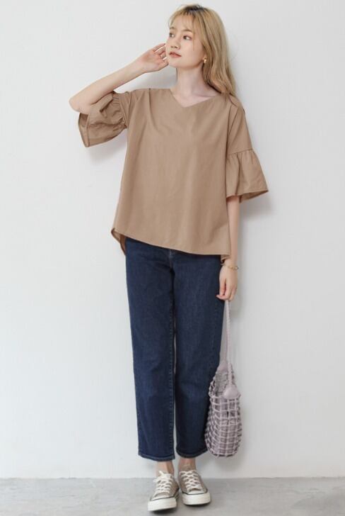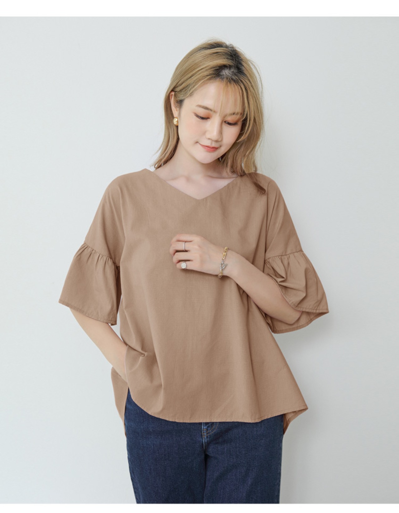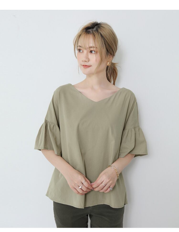 フェミニンなシルエットが魅力の半袖プルオーバー。Vネックとフレアスリーブが女性らしさを際立たせます。薄手で軽い素材なので、夏にぴったりです。裾はワイドなので、動きやすく、涼しく着こなせます。デニムやスカートなど、どんなボトムスとも合わせやすい万能アイテムです。
