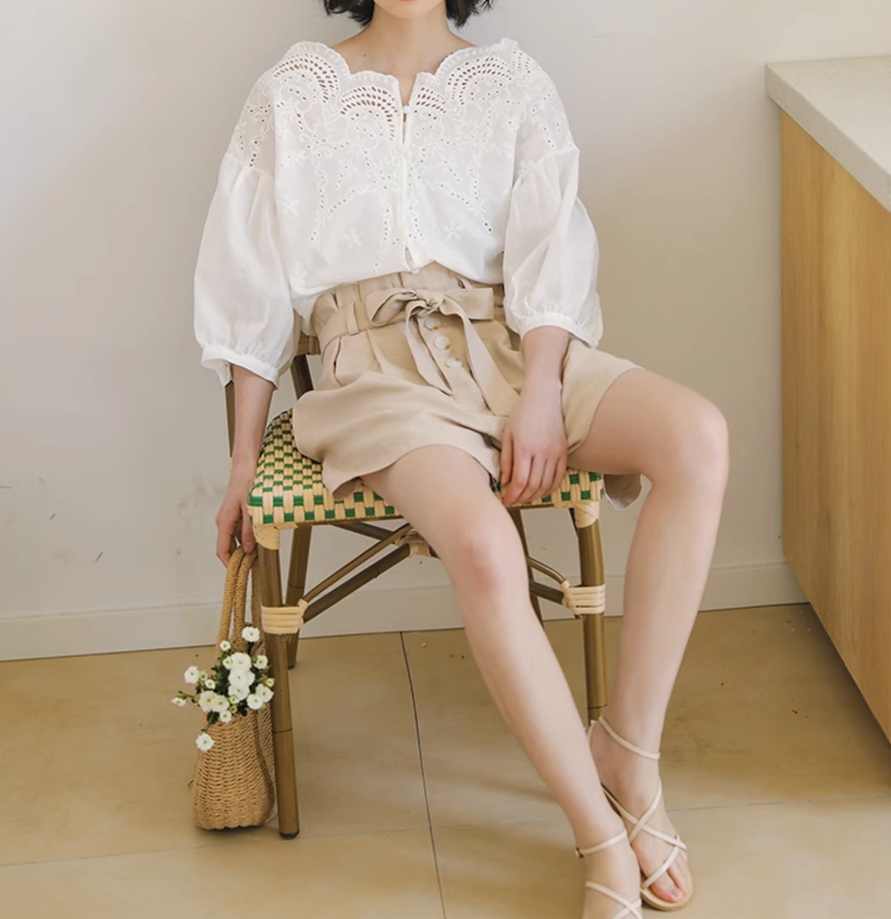 フリル襟がガーリーな印象を与え、五分袖のボリューム袖が華やかさを演出します。シンプルながらも、トップスとしての存在感をアピールできるアイテムです。ラウンドネックとIラインのストレートシルエットが、スマートな印象を与えます。さらに、ラウンドネックにはレースをあしらい、上品な雰囲気も演出。