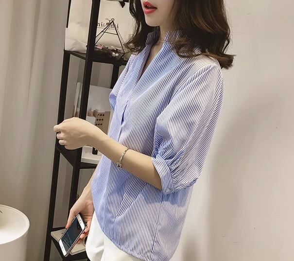 五分袖のストライプシャツが新登場!カジュアルでありながら上品な雰囲気を演出するアイテムです。ワイドなシルエットやVネックのデザインが、女性らしい美しさを引き立てます。五分袖で気軽に着られるので、春夏の季節にぴったりです。