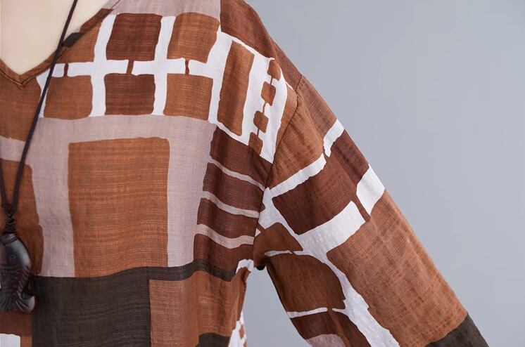 こちらのシャツは、レトロ柄が印象的なデザインが特徴。ノーカラーで、Vネックラインが女性らしいエレガントさを演出します。ゆったりとしたルーズシャツなので、体型をカバーしながらもスタイリッシュなシルエットを作り出します。
