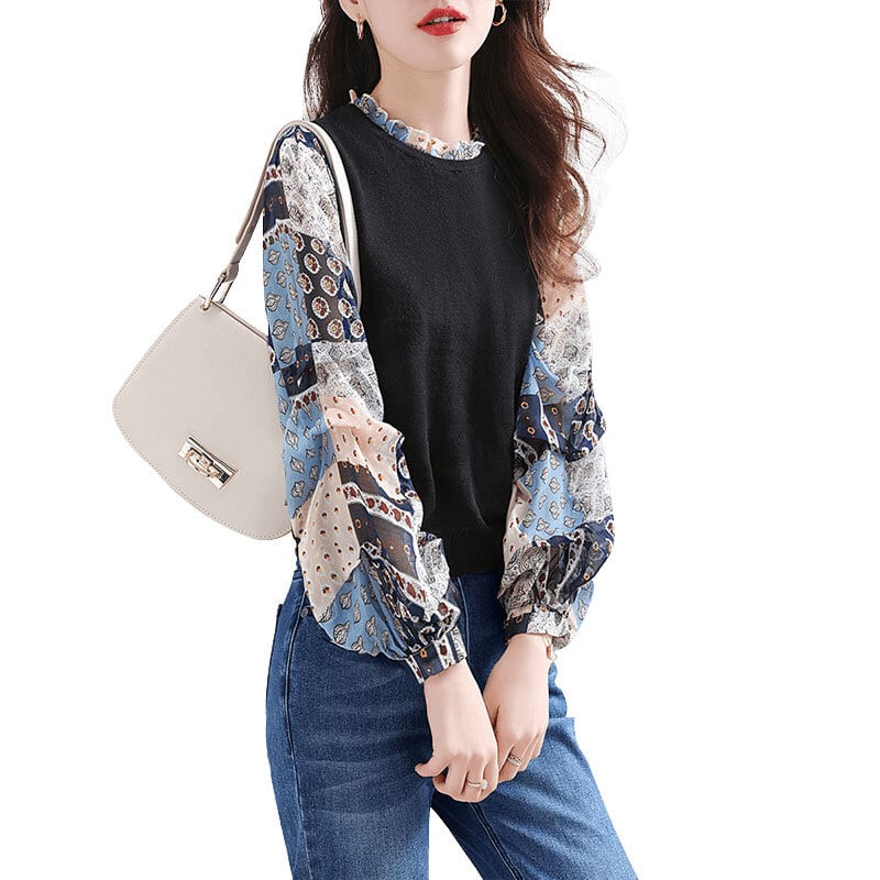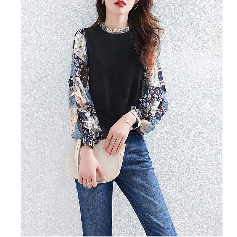 このレディーストップスは、長袖のプルオーバーで、ハイネックとスリムなシルエットが特徴です。シフォンプリント袖の切り替えデザインがポイントで、カジュアルながらも大人っぽい印象に仕上げてくれます♪