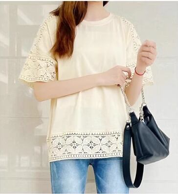 袖と裾にレースをあしらって、華やかさをプラスしました。薄手で透け感のある素材なので、夏にぴったりです。