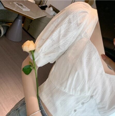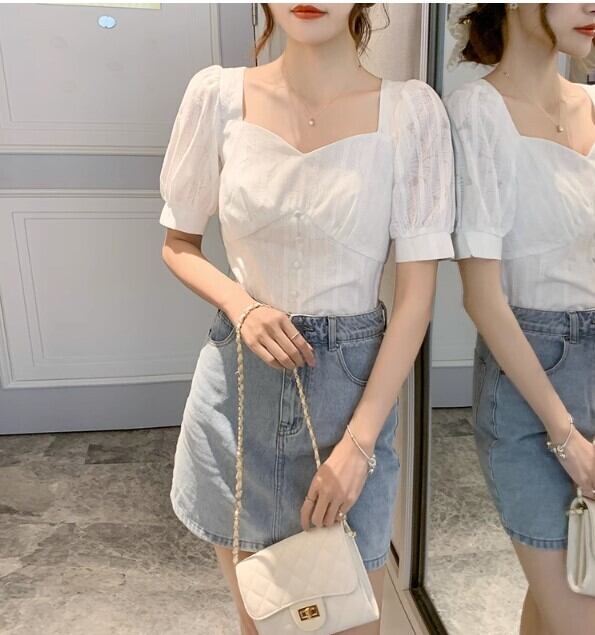 大人可愛い半袖ブラウス。パフスリーブとスクエアネックが魅力で、シンプルながらも存在感抜群。モード系のデザインがクールでありながら、エレガントな雰囲気も漂います。夏のコーディネートにぴったりの一着で、OLから学生まで幅広いシーンにマッチします。