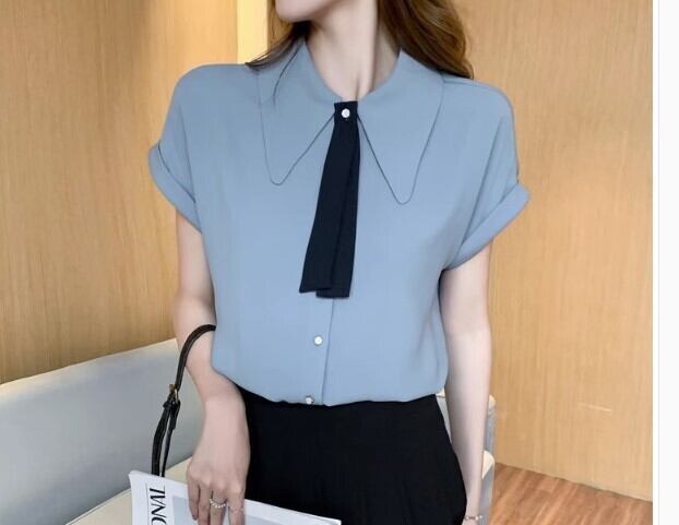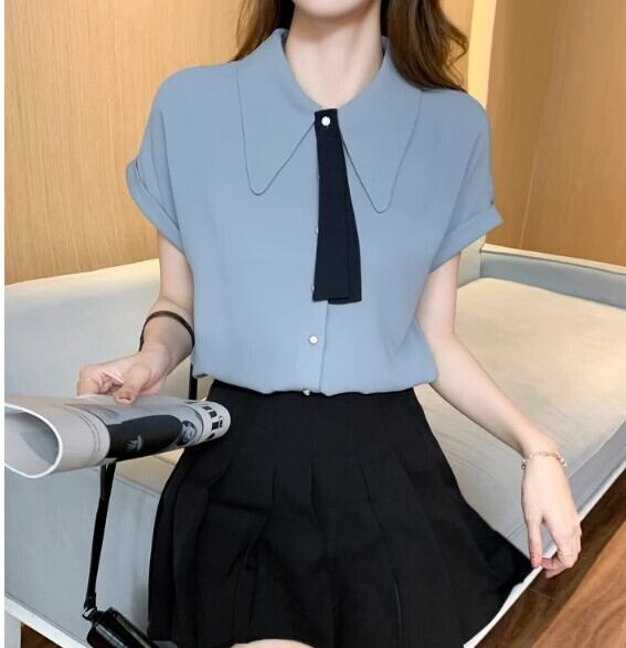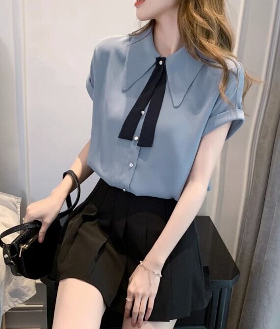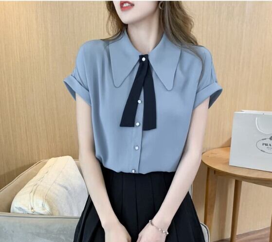 レディース トップス ブラウス 半袖 襟付き りぼんタイ 前開き かわいい 大人可愛い きれいめ シンプル カジュアル 上品 おしゃれ かっこいい こなれ感 ガーリー 個性的 モード系 エレガント モダン 主役級 存在感 とろみ感 抜け感 都会的 無地 夏 OL 学生 学校 通学 デート お出かけ お泊まり 旅行 レストラン 公園 女子会 休日 ホテル ガーデン ショッピング コンサート ライブ 合コン コンパ カフェ 婚活 韓国 オルチャン プレゼント プチプラ 普段使い 着回し インスタ映え