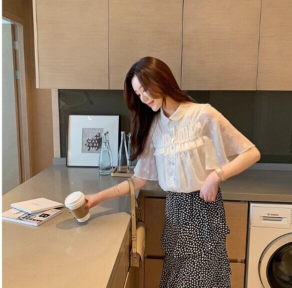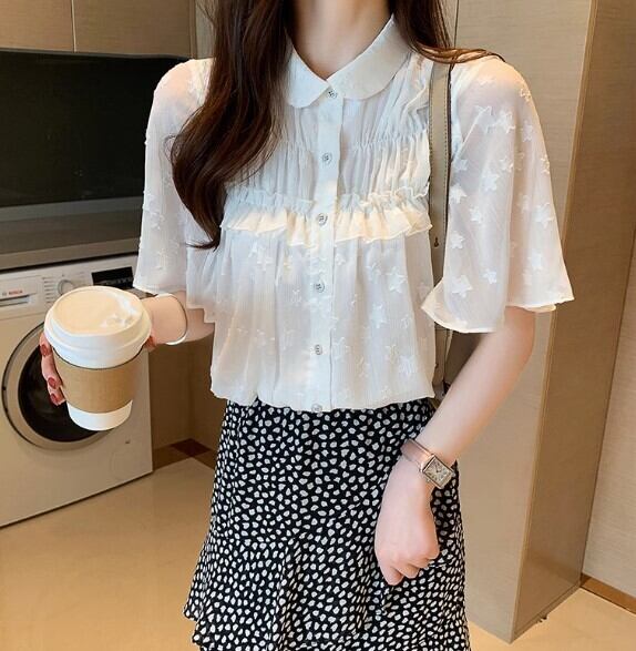 レディース トップス ブラウス 半袖 フレアスリーブ 襟付き 刺繍 フリル かわいい 大人可愛い きれいめ シンプル カジュアル 上品 おしゃれ かっこいい こなれ感 ガーリー 個性的 エレガント モダン 主役級 存在感 とろみ感 抜け感 キュート 都会的 星柄 夏 オフィス OL 学生 学校 通学 デート お出かけ お泊まり 旅行 レストラン 公園 女子会 休日 ホテル ガーデン ショッピング コンサート ライブ 合コン コンパ カフェ 婚活 韓国 オルチャン 普段使い 着回し モテ 清楚