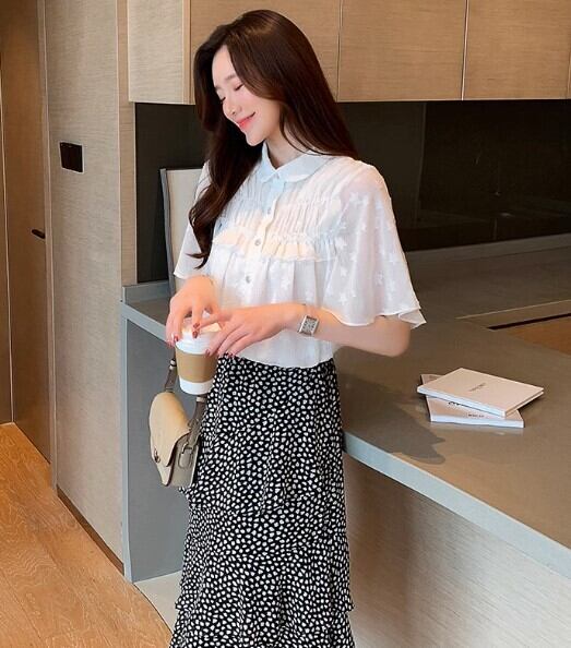 キュートな星柄が光る半袖ブラウス。フレアスリーブに刺繍やフリルが華やかさを添え、かわいさと大人の魅力が調和。シンプルな襟付きデザインで上品な印象も。都会的なエレガンスと主役級の存在感で、どんなシーンでも自信を持って。とろみ感のある素材が動きを美しく引き立て、抜け感のあるスタイリングが魅力です。