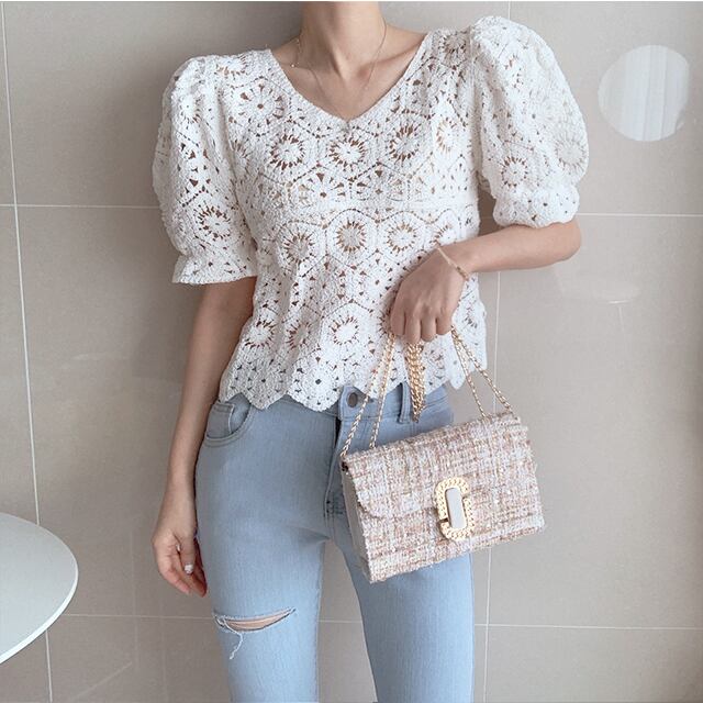 また、かぎ針編みモチーフが透け感をプラスし、フェミニンな雰囲気を演出します♪