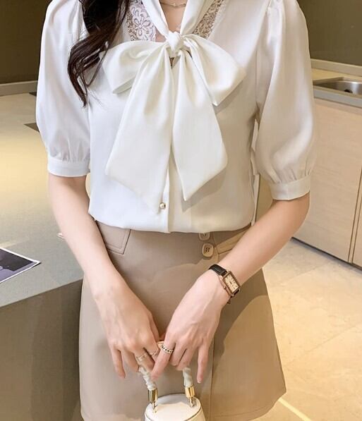 レディース トップス シャツ ブラウス 半袖 パフスリーブ りぼんタイ レース 刺繍 前開き かわいい 大人可愛い きれいめ シンプル カジュアル 上品 おしゃれ かっこいい こなれ感 モード系 エレガント モダン 主役級 存在感 とろみ感 抜け感 都会的 夏 オフィス ビジネス OL 学生 学校 通学 デート お出かけ お泊まり 旅行 レストラン 女子会 休日 高原 ホテル ガーデン ショッピング コンサート ライブ 合コン コンパ カフェ 婚活 韓国 オルチャン コーデ 楽ちん 普段使い 着回し 定番