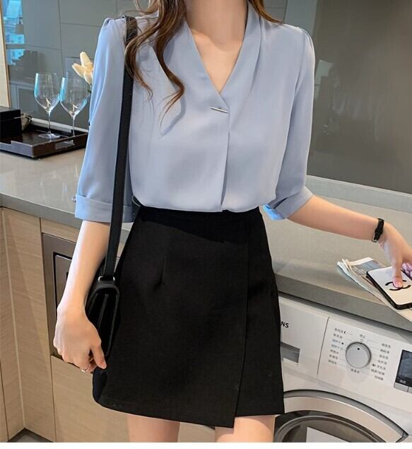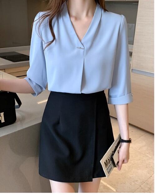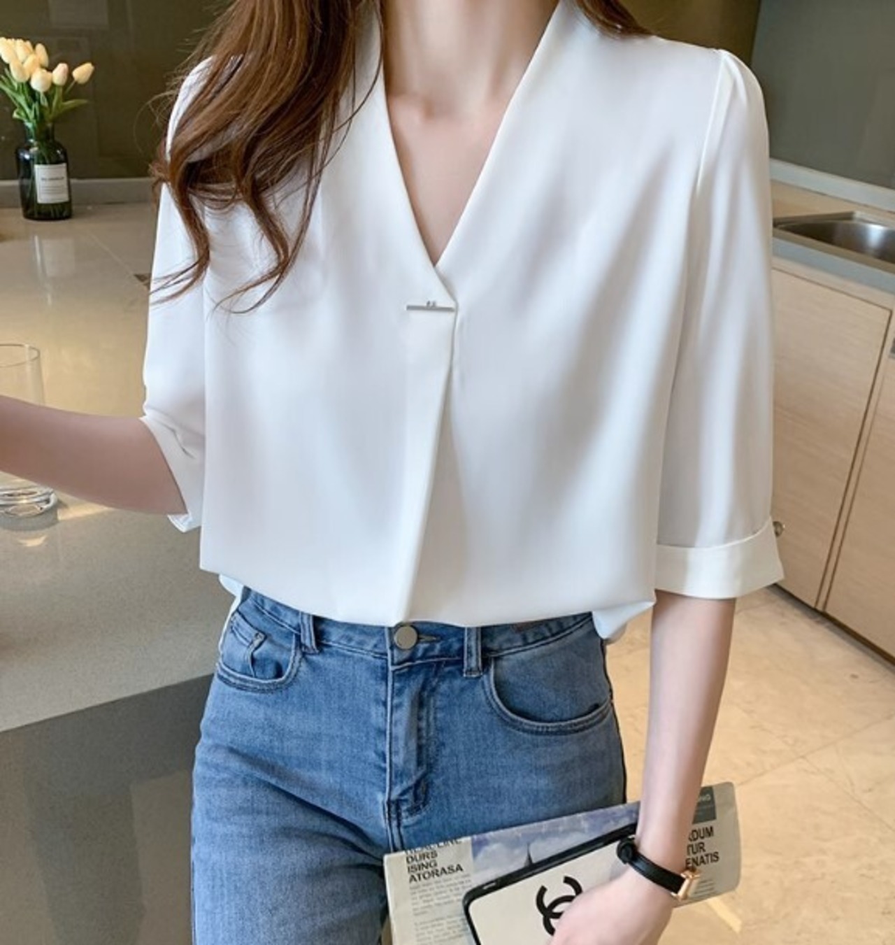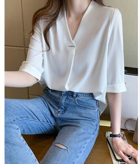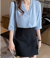 Vネックの7分袖ブラウス、襟なしデザインで大人可愛さを演出。シンプルで上品ながらも個性的なデザインが都会的なおしゃれを引き立てます。こなれ感と共に、クールでモード系な雰囲気を持ち、エレガントでモダンなスタイルを演出。主役級の存在感と抜け感が魅力。無地のデザインは春から活躍し、オフィスからデートまで多彩な場面に適しています。