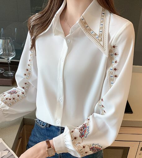 レディース トップス ブラウス 長袖 襟付き 刺繍 異国風 かわいい 大人可愛い きれいめ シンプル 上品 おしゃれ かっこいい レトロ アジアン こなれ感 ラフ マニッシュ ガーリー 個性的 モード系 エレガント 存在感 かっちり ラブリー キュート 都会的 ラグジュアリー クラシカル カレッジ風 ベーシック アメリカン カントリー 学生 学校 通学 デート お出かけ 女子会 休日 韓国 オルチャン コーデ 楽ちん プチプラ 普段使い 着回し レイヤード モテ 清楚 流行 インスタ映え 定番