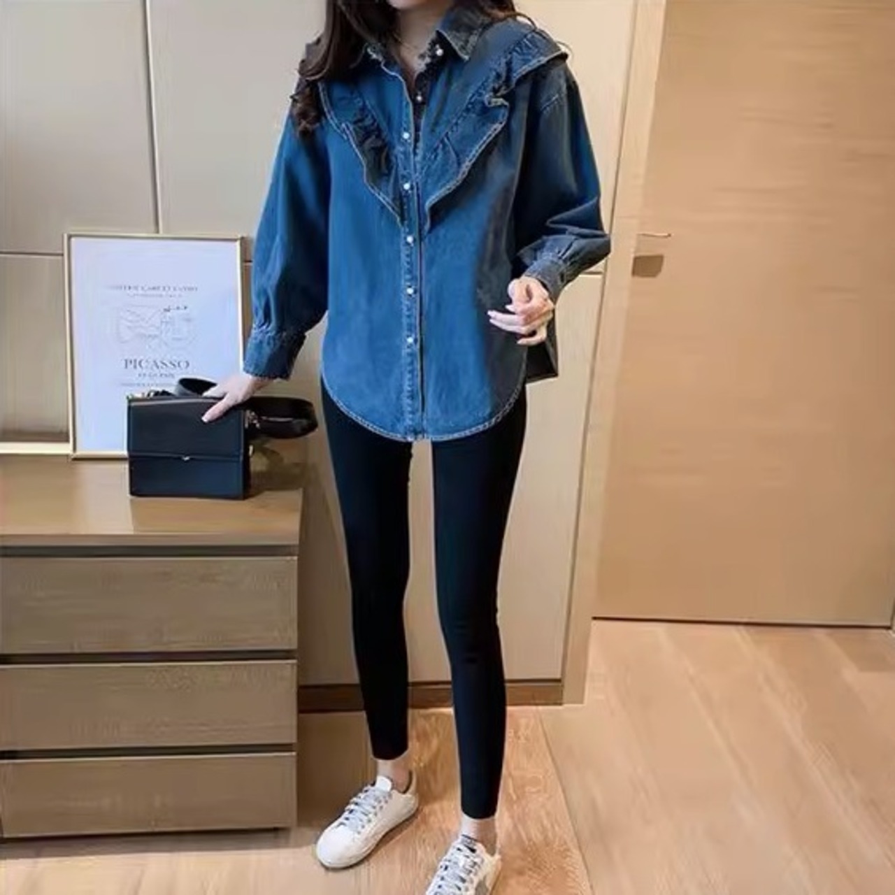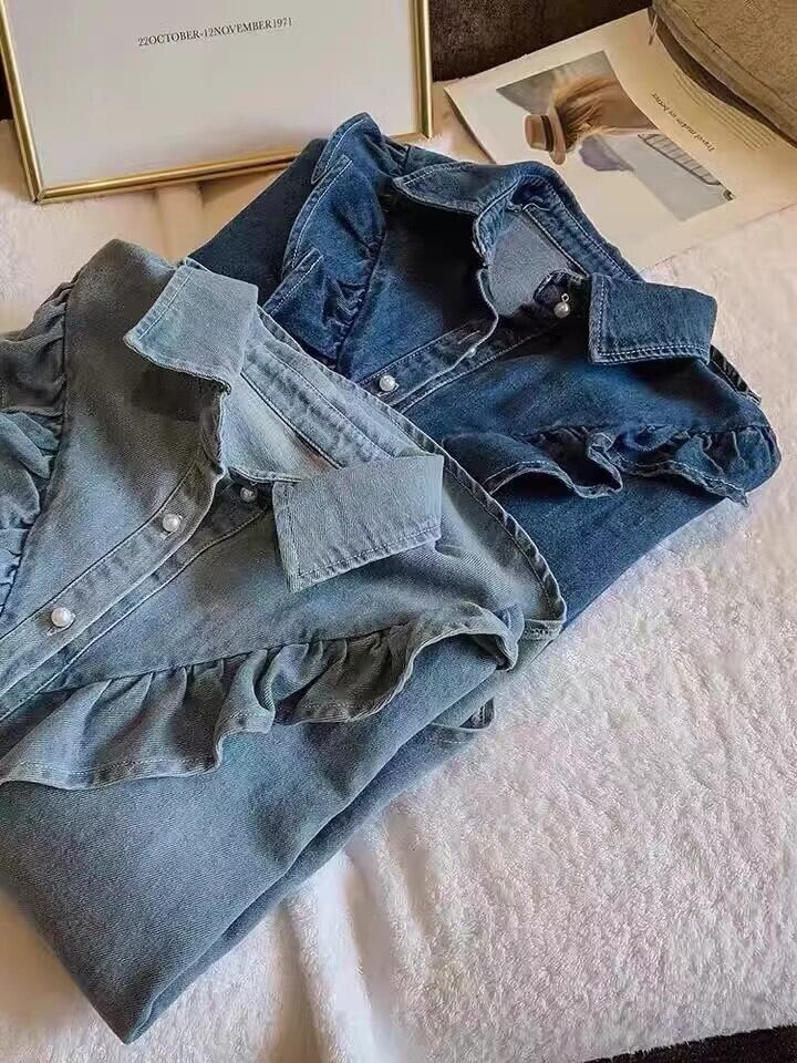 レディース トップス シャツ ブラウス デニム 長袖 襟付き ワイド フリル 前開き ボタン ブルーデニム 大人可愛い シンプル カジュアル おしゃれ レトロ こなれ感 ラフ ガーリー ルーズ 個性的 主役級 存在感 抜け感 ヴィンテージ キュート ラグジュアリー アメリカン アクティブ 休日感 フェミニン お茶目 ユニーク ニッチ 無邪気 キャッチー 無地 春 秋 学生 お出かけ アウトドア カフェ 楽ちん 体型カバー 普段使い 着回し 2XL 3XL 4XL 大きいサイズ ゆったり 水色 ブルー