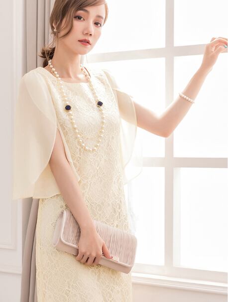 エレガントなレースが魅力のワンピースドレス。膝丈でスリムなシルエットなので、女性らしさを引き立てながらスタイルアップも叶います。チュール素材の袖部分が華やかさを演出し、ハイウエストのデザインで脚長効果も期待できます。