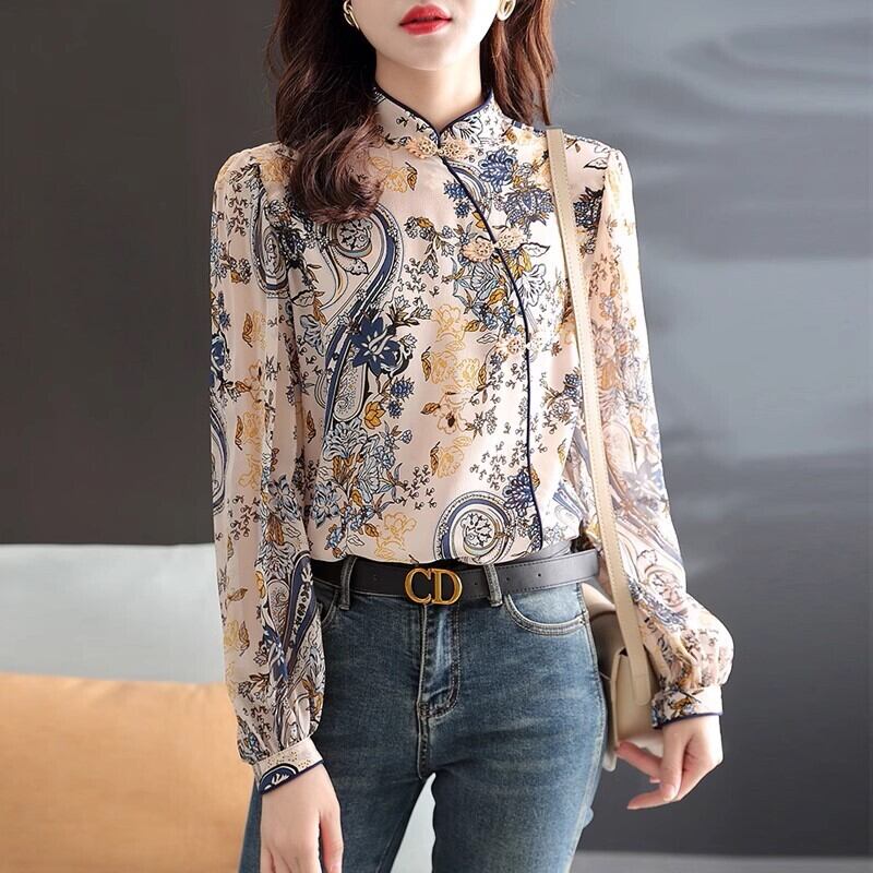 レディース トップス ブラウス 長袖 パフスリーブ モックネック スタンドネック 透け感 異国風 薄手 柔らか さらさら 大人可愛い カジュアル 上品 おしゃれ レトロ こなれ感 ラフ ルーズ 個性的 エレガント 主役級 存在感 抜け感 都会的 ラグジュアリー ロマンティック 大人女子 ユニーク ニッチ キャッチー チャイナ風 プリント 総柄 春 秋 お出かけ アウトドア 旅行 ショッピング 韓国 オルチャン 体型カバー 普段使い 着回し インスタ映え 3XL 大きいサイズ ゆとり感 ベージュ 大人カラー
