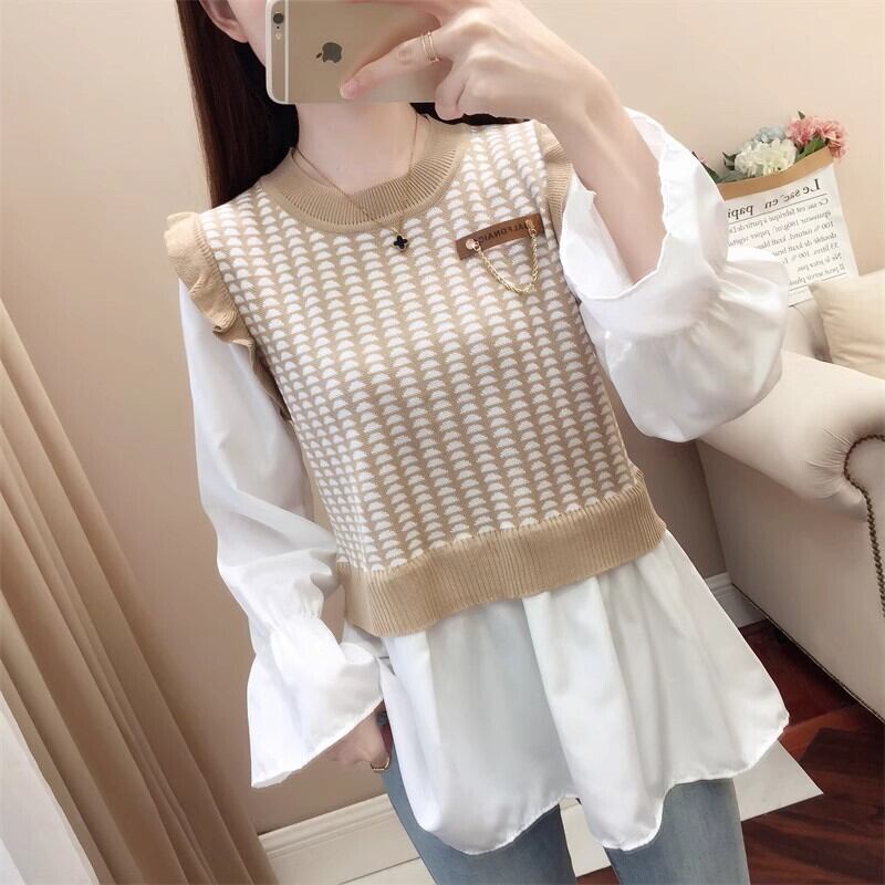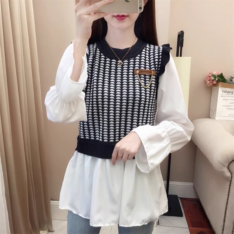 ブラウスとニットのレイヤードスタイルが1枚で叶う!一見重ね着コーデをしているようなデザインのトップス。ボリュームのある袖とフレアスリーブが、個性的なアクセントを加え、半円型のボーダー柄ニットベストがカジュアルな印象に。フレアな袖口や裾のシルエットが女性らしく華やかな雰囲気を纏い、体型カバーにもぴったり◎